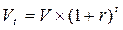 Сумма денег, скажем V, которая кладется на срочный вклад с ежегодной процентной ставкой r на t лет, станет по истечении этих лет суммой