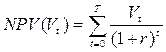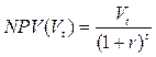 NPV представляет Чистую Настоящую Стоимость, также называемую Дисконтируемым Денежным Потоком. Кроме того, это должно быть подчеркнуто, что определение r обусловливается определением периода времени t. Если t выражен в месяцах, то r –ежемесячная ставка. Если t выражен в годах, то r – ежегодная ставка, и так далее. Для того чтобы обобщить это, рассмотрим серию величин {Vt}, t = 0,1,...,T, чтобы интерпретировать, что произойдет с Vt в периоде времени t. Чистая Настоящая Стоимость целой серии тогда рассчитывается по данной формуле: