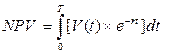 T - общее число периодов рассмотрения, иногда называемое горизонтом “инвестирования”. Для того чтобы сделать случаи соответствующими инвестиционному анализу, необходимо допустить, что остаточная стоимость после периода T осуществляется в конце этого периода также как, когда она не нулевая. Рассматривая решение о жизненном цикле информационных систем, T равняется количеству периодов времени в этом жизненном цикле. В случае если конец жизненного цикла не совпадает с концом жизненного цикла некоторого аппаратного или программного компонента, который включен, должна рассматриваться и остаточная стоимость. Вышеуказанная формула была для дискретной серии величин {Vt}, t = 0,1,...,T. В случае, когда величина является непрерывной функцией времени V(t), которая связана со временем рассмотрения до некоторой степени как континуум с серией дискретных периодов, бесконечно малый итог становится интеграцией, и, следовательно, в этом случае