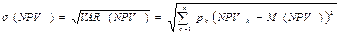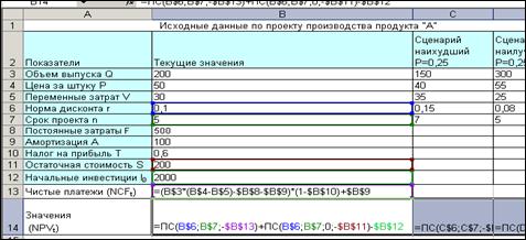 Пример 3. Метод сценариев. Предположим, что по результатам анализа проекта примера 2 были составлены следующие сценарии его развития и определены возможные вероятности их осуществления. Провести анализ собственного риска проекта. Расчет NCF и NPV, исходя из исходных данных ячеек D3:D12 (наиболее вероятные значения):