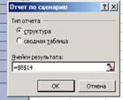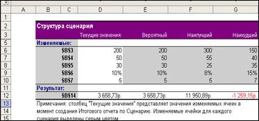 1.3. Введите имя сценария (Вероятный). 1.4. Самостоятельно задайте для сценариев «Наилучший» и «Наихудший» адреса изменяемых ячеек (блок В3:В7) и введите для новых сценариев соответствующие значения. Наилучший: Наихудший: 1.5. Нажмите кнопку: Отчет – тип отчета - Структура. Ячейка результатов – B14. далее автоматически будет сформирован отчет на отдельном листе рабочей книги.