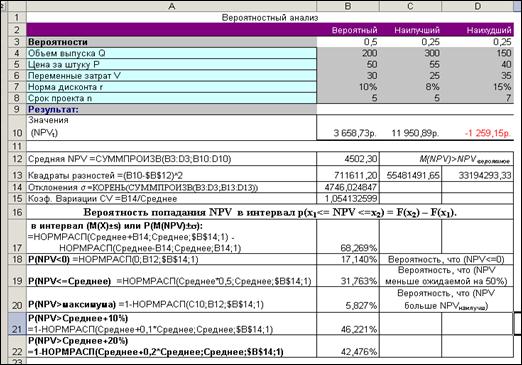 2.1. Скопируем лист «Структура сценария», назвав копию «Анализ рисков», и изменим его. 2.2. Определим среднее ожидаемое значение NPV (ячейка B12): Заметим, что среднее ожидаемое значение больше вероятного значения: (M(NPV) = 4502,3)>(NPVвероят =3658,73), 2.3. Для вычисления стандартного отклонения 2.3.1. предварительно определим квадраты разностей между средней ожидаемой NPV и множеством ее полученных значений (ячейка B13) =(B10-$B$12)^2 = 711611,20. 2.3.2. Вычислим квадратный корень из дисперсии (ячейка B14) = КОРЕНЬ(СУММПРОИЗВ(B3:D3;B13:D13)) = 4746,02 Заметим, что среднее ожидаемое значение меньше стандартного отклонения: (M(NPV) = 4502,3)<(s(NPV) = 4746.02) 2.4. Определим коэффициент вариации Значение коэффициента вариации CV>1, следовательно, риск данного проекта на среднюю единицу дохода несколько выше. 2.5. Исходяиз соотношения р(x1<= Е <=x2) = F(x2) – F(x1) определим вероятность того, что NPV попадет в интервал в интервал (М(Х)± s), т.е. определим P(M(NPV)±s) (ячейка В17): F(x2) – F(x1) = F(М(Х)+ s) – F(М(Х) - s) или =НОРМРАСП(М(NPV)+ s; М(NPV); s;1) - НОРМРАСП(М(NPV) -s; М(NPV); s;1) или =НОРМРАСП(B12+B14; B12;B14;1)-НОРМРАСП(B12-B14; B12;B14;1) = 68,3% Исходя из предположения о нормальном распределении случайной величины, с вероятностью около 70% можно утверждать, что значение NPV будет находиться в диапазоне 4502,03±4673,62. 2.6. Определим вероятность того, что NPV будет иметь нулевое или отрицательное значение, p(NPV)<=0): (ячейка В18) =НОРМРАСП(0;B12;$B$14;1)=17.4%. Существует приблизительно один шанс из шести возникновения убытков. 2.7. Определим вероятность того, что NPV будет меньше ожидаемой М(NPV) на 50%, P(NPV<= 0,5*M(NPV)) - ячейка В19: =НОРМРАСП(B12 *0,5; B12;B14;1) = 32%. 2.8. Определим вероятность того, что NPV будет больше NPVнаилучшего, P(NPV> NPVнаилучшего) ) - ячейка В20: =1-НОРМРАСП(С10;B12;$B$14;1)=5.8% 2.9. Определим вероятность того, что NPV будет больше ожидаемой М(NPV) на 10%, P(NPV> 1,1*M(NPV)) ) - ячейка В21: =1-НОРМРАСП(1,1*Среднее;Среднее;$B$14;1) = 46% 2.10. Определим вероятность того, что NPV будет больше ожидаемой М(NPV) на 20%, P(NPV> 1,2*M(NPV)) ) - ячейка В22: =1-НОРМРАСП(1,2*Среднее;Среднее;$B$14;1) = 43%