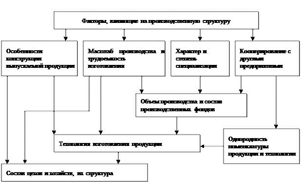 Рис. 2. - Факторы, влияющие на производственную структуру. Второй тип построения производственной структуры предприятия – предметный. В основу создания цехов положен предметный признак, когда цехи специализируются на изготовлении определенной ограниченной номенклатуры изделий, узлов и деталей, используя при этом различные в технологическом отношении процессы и операции, используют различное оборудование. Этот тип построения производственной структуры является наиболее прогрессивным, то есть предметная специализация дает организовать предметно-замкнутые участки в серийном производстве и поточные линии в массивном производстве. Смешанный тип построения производственной структуры получает распространение по мере увеличения масштабов производства и как следствие углубления технологической специализации цехов с учетом габаритов оборудования или продукции, используемого метала или других признаков. В основу создания цехов таких предприятий положен предметно-технологический принцип, когда технологически специализированные цехи в то же время имеют ограниченную номенклатуру предметного порядка. Например, на заводах станкостроения механические цехи могут специализироваться как цехи крупных, средних и мелких деталей. Фиксированный тип построения производственной структурыхарактерен для строительных предприятий, когда объекты стройки остаются недвижимыми, а все необходимые ресурсы подвозятся предприятием к месту строительства. Общая структура производственного предприятия выглядит следующим образом (рис.3).