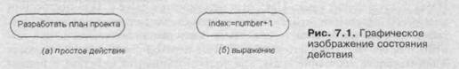 Состояние действия (action state) является специальным случаем состояния с некоторым входным действием и по крайней мере одним выходящим из состояния переходом. Этот переход неявно предполагает, что входное действие уже завершилось. Состояние действия не может иметь внутренних переходов, поскольку оно является элементарным. Обычное использование состояния действия заключается в моделировании одного шага выполнения алгоритма (процедуры) или потока управления. Графически состояние действия изображается фигурой, напоминающей прямоугольник, боковые стороны которого заменены выпуклыми дугами (рис. 7.1). Внутри этой фигуры записывается выражение действия (action-expression), которое должно быть уникальным в пределах одной диаграммы деятельности.