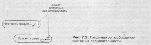 Действие может быть записано на естественном языке, некотором псевдокоде или языке программирования. Никаких дополнительных или неявных ограничений при записи действий не накладывается. Рекомендуется в качестве имени простого действия использовать глагол с пояснительными словами (рис. 7.1, а). Если же действие может быть представлено в некотором формальном виде, то целесообразно записать его на том языке программирования, на котором предполагается реализовывать конкретный проект (рис. 7.1, 6). Иногда возникает необходимость представить на диаграмме деятельности некоторое сложное действие, которое, в свою очередь, состоит из нескольких более простых действий. В этом случае можно использовать специальное обозначение так называемого состояния под-деятельности (subactivity state). Такое состояние является графом деятельности и обозначается специальной пиктограммой в правом нижнем углу символа состояния действия (рис. 7.2). Эта конструкция может применяться к любому элементу языка UML, который поддерживает «вложенность» своей структуры. При этом пиктограмма может быть дополнительно помечена типом вложенной структуры.