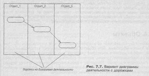 Диаграммы деятельности могут быть использованы не только для спецификации алгоритмов вычислений или потоков управления в программных системах. Не менее важная область их применения связана с моделированием бизнес-процессов. Действительно, деятельность любой компании (фирмы) также представляет собой не что иное, как совокупность отдельных действий, направленных на достижение требуемого результата. Однако применительно к бизнес-процессам желательно выполнение каждого действия ассоциировать с конкретным подразделением компании. В этом случае подразделение несет ответственность за реализацию отдельных действий, а сам бизнес-процесс представляется в виде переходов действий из одного подразделения к другому. Для моделирования этих особенностей в языке UML используется специальная конструкция, получившее название дорожка (swimlanes. Имеется в виду визуальная аналогия с плавательными дорожками в бассейне, если смотреть на соответствующую диаграмму. При этом все состояния действия на диаграмме деятельности делятся на отдельные группы, которые отделяются друг от друга вертикальными линиями. Две соседние линии и образуют дорожку, а группа состояний между этими линиями выполняется отдельным подразделением (отделом, группой, отделением, филиалом) компании (рис. 7.7). Названия подразделений явно указываются в верхней части дорожки. Пересекать линию дорожки могут только переходы, которые в этом случае обозначают выход или вход потока управления в соответствующее подразделение компании. Порядок следования дорожек не несет какой-либо семантической информации и определяется соображениями удобства. В качестве примера рассмотрим фрагмент диаграммы деятельности торговой компании, обслуживающей клиентов по телефону. Подразделениями компании являются отдел приема и оформления заказов, отдел продаж и склад. Этим подразделениям будут соответствовать три дорожки на диаграмме деятельности, каждая из которых специфицирует зону ответственности подразделения. В данном случае диаграмма деятельности заключает в себе не только информацию о последовательности выполнения рабочих действий, но и о том, какое из подразделений торговой компании должно выполнять то или иное действие (рис. 7.8).