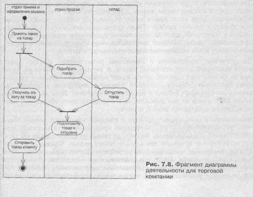 Из указанной диаграммы деятельности сразу видно, что после принятия заказа от клиента отделом приема и оформления заказов осуществляется распараллеливание деятельности на два потока (переход-разделение). Первый из них остается в этом же отделе и связан с получением оплаты от клиента за заказанный товар. Второй инициирует выполнение действия по подбору товара в отделе продаж (модель товара, размеры, цвет, год выпуска и пр.). По окончании этой работы инициируется действие по отпуску товара со склада. Однако подготовка товара к отправке в торговом отделе начинается только после того, как будет получена оплата за товар от клиента и товар будет отпущен со склада (переход-соединение). Только после этого товар отправляется клиенту, переходя в его собственность.