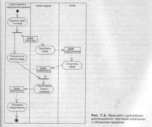 В общем случае действия на диаграмме деятельности выполняются над теми или иными объектами. Эти объекты либо инициируют выполнение действий, либо определяют некоторый результат этих действий. При этом действия специфицируют вызовы, которые передаются от одного объекта графа деятельности к другому. Поскольку в таком ракурсе объекты играют определенную роль в понимании процесса деятельности, иногда возникает необходимость явно указать их на диаграмме деятельности. Для графического представления объектов, как уже упоминалось в главе 5, используются прямоугольник класса, с тем отличием, что имя объекта подчеркивается. Далее после имени может указываться характеристика состояния объекта в прямых скобках. Такие прямоугольники объектов присоединяются к состояниям действия отношением зависимости пунктирной линией со стрелкой. Соответствующая зависимость определяет состояние конкретного объекта после выполнения предшествующего действия. На диаграмме деятельности с дорожками расположение объекта может иметь некоторый дополнительный смысл. А именно, если объект расположен на границе двух дорожек, то это может означать, что переход к следующему состоянию действия в соседней дорожке ассоциирован с готовностью некоторого документа (объект в некотором состоянии). Если же объект целиком расположен внутри дорожки, то и состояние этого объекта целиком определяется действиями данной дорожки. Возвращаясь к предыдущему примеру с торговой компанией, можно заметить, что центральным объектом процесса продажи является заказ или вернее состояние его выполнения. Вначале до звонка от клиента заказ как объект отсутствует; возникает лишь после такого звонка. Однако этот заказ еще не заполнен до конца, поскольку требуется еще подобрать конкретный товар в отделе продаж. После его подготовки он передается на склад, где вместе с отпуском товара заказ окончательно дооформляется. Наконец, после получения подтверждения об оплате товара эта информация заносится в заказ, и он считается выполненным и закрытым. Данная информация может быть представлена графически в виде модифицированного варианта диаграммы деятельности этой же торговой компании (рис. 7.9). Примечание Более подробно правила именования объектов и их использования будут рассмотрены при построении диаграммы кооперации. Что касается диаграмм деятельности, то применительно к ним объекты играют вспомогательную роль и поэтому здесь детально не рассматриваются. Следует также помнить, что на диаграмме деятельности один и тот же объект может быть изображен несколько раз, что не должно вносить неопределенность в спецификацию состояний действия.