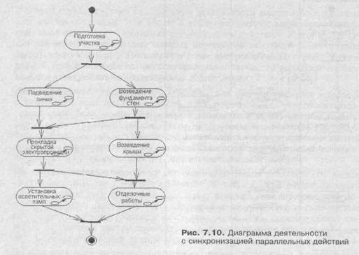 В заключение следует остановиться на необходимости синхронизации отдельных действий на диаграмме деятельности. Такая необходимость возникает всякий раз, когда параллельно выполняемые действия оказывают влияние друг на друга. Применительно к диаграмме состояний для этой цели применялось специальное псевдосостояние — синхронизирующее состояние. На диаграмме деятельности никаких дополнительных обозначении не используется, поскольку синхронизация параллельных процессов может быть реализована с помощью переходов «разделение-слияние». В качестве примера рассмотрим упрощенную ситуацию с моделированием процесса постройки дома (см. тему Диаграммы состояний). Напомним, что в этом примере постройка дома включает в себя строительные работы (возведение фундамента и стен, возведение крыши и отделочные работы) и работы по электрификации дома (подведение электрической линии, прокладка скрытой электропроводки и установка осветительных ламп). Синхронизация параллельного выполнения этого комплекса работ может быть явно указана на диаграмме деятельности (рис. 7.10).