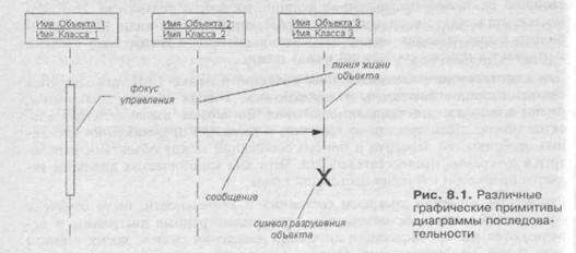 Крайним слева на диаграмме изображается объект, который является инициатором взаимодействия (объект 1 на рис. 8.1). Правее изображается другой объект, который непосредственно взаимодействует с первым. Таким образом, все объекты на диаграмме последовательности образуют некоторый порядок, определяемый степенью активности этих объектов при взаимодействии друг с другом. Второе измерение диаграммы последовательности — вертикальная временная ось, направленная сверху вниз. Начальному моменту времени соответствует самая верхняя часть диаграммы. При этом взаимодействия объектов реализуются посредством сообщений, которые посылаются одними объектами другим. Сообщения изображаются в виде горизонтальных стрелок с именем сообщения и также образуют порядок по времени своего возникновения. Другими словами, сообщения, расположенные на диаграмме последовательности выше, инициируются раньше тех, которые расположены ниже. При этом масштаб на оси времени не указывается, поскольку диаграмма последовательности моделирует лишь временную упорядоченность взаимодействий типа “раньше-позже”.