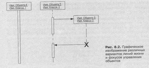 Линия жизни объекта (object lifeline) изображается пунктирной вертикальной линией, ассоциированной с единственным объектом на диаграмме последовательности. Линия жизни служит для обозначения периода времени, в течение которого объект существует в системе и, следовательно, может потенциально участвовать во всех ее взаимодействиях. Если объект существует в системе постоянно, то и его линия жизни должна продолжаться по всей плоскости диаграммы последовательности от самой верхней ее части до самой нижней (объекты 1 и 2 на рис. 8.1). Отдельные объекты, выполнив свою роль в системе, могут быть уничтожены (разрушены), чтобы освободить занимаемые ими ресурсы. Для таких объектов линия жизни обрывается в момент его уничтожения. Для обозначения момента уничтожения объекта в языке UML используется специальный символ в форме латинской буквы “Х” (объект 3 на рис. 8.1). Ниже этого символа пунктирная линия не изображается, поскольку соответствующего объекта в системе уже нет, и этот объект должен быть исключен из всех последующих взаимодействий. Вовсе не обязательно создавать все объекты в начальный момент времени. Отдельные объекты в системе могут создаваться по мере необходимости, существенно экономя ресурсы системы и повышая ее производительность. В этом случае прямоугольник такого объекта изображается не в верхней части диаграммы последовательности, а в той ее части, которая соответствует моменту создания объекта (объект 6 на рис. 8.2). При этом прямоугольник объекта вертикально располагается в том месте диаграммы, которое по оси времени совпадает с моментом его возникновения в системе. Очевидно, объект обязательно создается со своей линией жизни и, возможно, с фокусом управления.