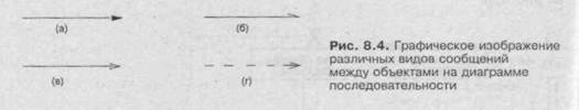 В языке UML могут встречаться несколько разновидностей сообщений, каждое из которых имеет свое графическое изображение (рис. 8.4). Первая разновидность сообщения (рис. 8.4. а) является наиболее распространенной и используется для вызова процедур, выполнения операций или обозначения отдельных вложенных потоков управления. Начало этой стрелки всегда соприкасается с фокусом управления или линией жизни того объекта-клиента, который инициирует это сообщение. Конец стрелки соприкасается с линией жизни того объекта, который принимает это сообщение и выполняет в ответ определенные действия. При этом принимающий объект зачастую получает и фокус правления, становись активным. Вторая разновидность сообщения (рис. 8.4, б) используется для обозначения простого (не вложенного) потока управления. Каждая такая стрелка указывает на прогресс одного шага потока. При этом соответствующие сообщения обычно являются асинхронными, т. е. могут возникать в произвольные моменты времени. Передача такого сообщения обычно сопровождается получением фокуса управления объектом, его принявшим. Третья разновидность (рис. 8.4, в) явно обозначает асинхронное сообщение между двумя объектами в некоторой процедурной последовательности. Примером такого сообщения может служить прерывание операции при возникновении исключительной ситуации. В этом случае информация о такой ситуации передается вызывающему объекту для продолжения процесса дальнейшего взаимодействия. Наконец, последняя разновидность сообшения (рис. 8.4, г) используется для возврата из вызова процедуры. Примером может служить простое сообщение о завершении некоторых вычислений без предоставления результата расчетов объекту-клиенту. В процедурных потоках управления эта стрелка может быть опущена, поскольку ее наличие неявно предполагается в конце активизации объекта. В то же время считается, что каждый вызов процедуры имеет свою пару — возврат вызова. Для непроцедурных потоков управления, включая параллельные и асинхронные сообщения, стрелка возврата должна указываться явным образом. Обычно сообщения изображаются горизонтальными стрелками, соединяющими линии жизни или фокусы управления двух объектов на диаграмме последовательности. При этом неявно предполагается, что время передачи сообщения достаточно мало по сравнению с процессами выполнения действий объектами. Считается также, что за время передачи сообщения с соответствующими объектами не может произойти никаких событий. Другими словами, состояния объектов остаются без изменения. Если же это предположение не может быть признано справедливым, то стрелка сообщения изображается под некоторым наклоном, так чтобы конец стрелки располагался ниже ее начала. В отдельных случаях объект может посылать сообщения самому себе, инициируя так называемые рефлексивные сообщения (объект 8 на рис. 8.3). Такие сообщения изображаются прямоугольником со стрелкой, начало и конец которой совпадают. Подобные ситуации возникают, например, при обработке нажатий на клавиши клавиатуры при вводе текста в редактируемый документ, при наборе цифр номера телефона абонента. Таким образом, в языке UML каждое сообщение ассоциируется с некоторым действием, которое должно быть выполнено принявшим его объектом. При этом действие может иметь некоторые аргументы ил