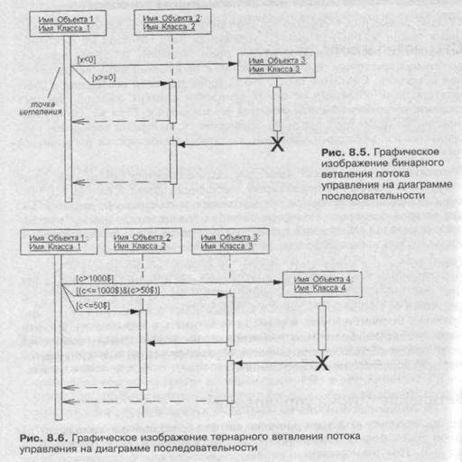 Для изображения ветвления рисуются две или более стрелки, выходящие из одной точки фокуса управления объекта (фокус управления объекта 1 на рис. 8.5). При этом соответствующие условия должны быть явно указаны рядом с каждой из стрелок в форме сторожевого условия. Как нетрудно представить. если условие записано в форме булевского выражения, то ветвление будет содержать только две ветви. В любом случае условия должны взаимно исключать одновременную передачу альтернативных сообщений. С помощью ветвления можно изобразить и более сложную логику взаимодействия объектов между собой (фокус управления объекта 1 на рис. 8.6). Если условий более двух, то для каждого из них необходимо предусмотреть ситуацию единственного выполнения. Рассматриваемый пример относится к моделированию взаимодействия программной системы обслуживания клиентов в банке. На этом примере диаграммы последовательности объект 1 передает управление одному из трех других объектов.