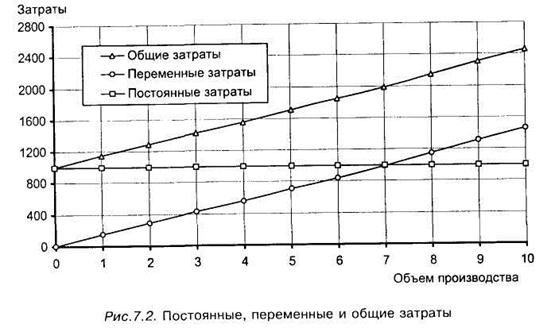 Под общими, или валовыми, затратами предприятия понимается сумма его постоянных и переменных затрат. Величина общих, или валовых, затрат соотносится в первую очередь с функционированием всего предприятия как единого целого. В табл. 9.4 представлены гипотетические данные о величине постоянных, переменных и общих затрат в сочетании с изменяющимся объемом производства продукции.