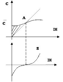 Но так как часть дохода сберегается, функция потребления принимает вид изогнутой кривой, берущей начало с минимального уровня потребления (автономный уровень). А – точка нулевого сбережения. Заштрихованная область левее точки А – сектор отрицательных сбережений, где потребление выше дохода, зона правее точки А – сектор положительных сбережений. Из этого следует, что можно получить функцию сбережений, график которой представляет собой расстояние по вертикали между сорокапятиградусной линией и графиком функции потребления.