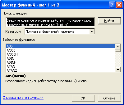 Рис. 3. Вид окна «Мастера функций». Шаг 1.