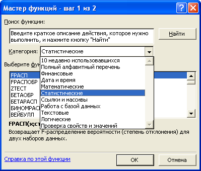 Для того чтобы ускорить поиск требуемой функции в достаточно объемном списке функций программы Excel, рекомендуется выбрать нужный («Статистический») подраздел этого списка (см. рис. 4).