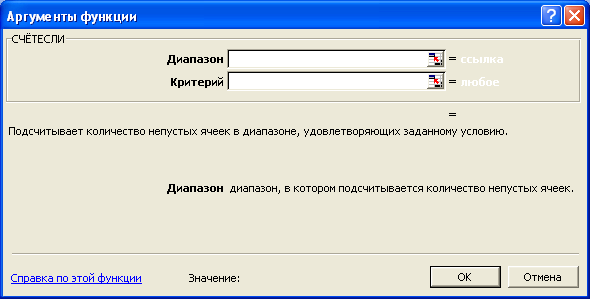 4. В результате этого действия на экране появится диалоговое окно (см. рис. 6), в котором можно задать требуемые значения аргументов функции - диапазона ячеек и критерия. После клика по кнопке «ОК» в ячейке электронной таблицы будет отображен требуемый результат.