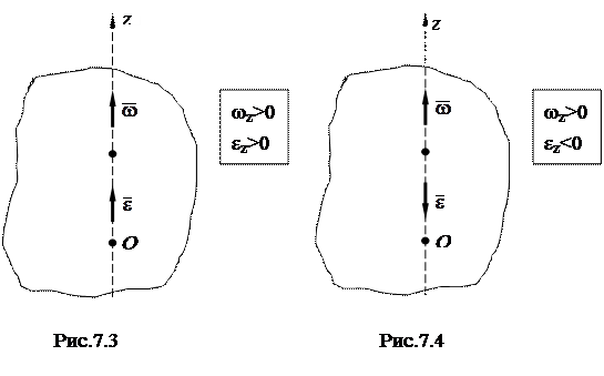 Если и имеют одинаковые знаки, т.е. , векторы и направлены в одну сторону (рис. 7.3) и тело как мы знаем, вращается ускоренно. Если и имеют разные знаки, т.е. , то векторы и направлены в разные стороны (рис. 7.4) и тело вращается замедленно.