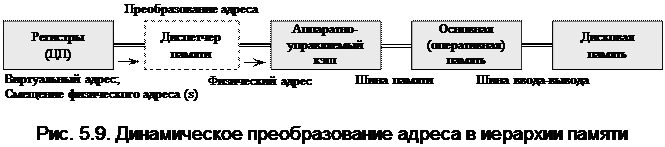 Способ 2: динамическое преобразование адресов. Программа загружается в память в неизмененном виде в виртуальных адресах, при этом операционная система фиксирует смещение действительного расположения программного кода относительно виртуального адресного пространства. Во время выполнения программы при каждом обращении к оперативной памяти выполняется преобразование виртуального адреса в физический адрес. На рис. 5.8. показана описанная структура преобразования адресов. Например, операционная система использует линейно-структурированное виртуальное адресное пространство, и под ее управлением работает программа, которая загружена в физическую память, начиная с адреса s. Операционная система запоминает значение начального смещения s и во время выполнения команды программы помещает его в специальный регистр процессора. В другом регистре центрального процессора содержится виртуальный адрес команды, который перед ее выборкой должен быть преобразован в физический. Прочитав из памяти и декодировав команду, процессор получает виртуальные адреса ее операндов. Перед использованием для чтения значений операндов из памяти или их записи в память эти адреса путем прибавления к ним смещения s преобразуются в абсолютные физические адреса. Динамическое отображение виртуального адресного пространства программы в физическую память производится аппаратным обеспечением во время выполнения программы, так как настройка адресов требуется при каждом обращении к памяти. В линейно-структурированном виртуальном адресном пространстве каждый модуль располагается в памяти непрерывным блоком, а все адреса в нем задаются относительно его начала. Физический адрес начала модуля называется базой процесса. Пусть выбранная и декодированная процессором команда содержит некоторый адрес. Этот адрес задан относительно базы, поэтому к нему нужно прибавить значение базы (смещение) для получения физического адреса, направляемого в контроллер памяти. Простейшее аппаратное обеспечение для динамической настройки адресов состоит из базового регистра и диспетчера памяти (Memory Management Unit, MMU). В ходе настройки состояния процесса перед передачей ему управления операционная система должна загрузить в базовый регистр нужное значение.
