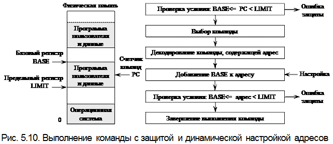 Этот простой механизм настройки адресов не обеспечивает процессам защиты, так как добавление базового адреса к каждому адресу, по которому обращается программа, не гарантирует, что полученные адреса укажут на память, выделенную данной программе. Для обеспечения защиты вводится второй предельный (граничный) регистр, который определяет верхнюю границу адресного пространства программы. На рис. 5.10 показан типичный цикл выполнения команды, включающий настройку адресов и их защитную проверку. Аппаратное обеспечение для настройки адресов, преобразующее виртуальные адреса в реальные во время выполнения программы, впервые было применено в начале 1960-х годов. Но еще до его появления во многих компьютерах использовались регистры защиты. Существовали разные формы защиты, но их основная идея была одинаковой: проверка каждого адреса на основе значений, заданных в аппаратных регистрах. Так, выбрав для выполнения очередной процесс, операционная система загружала адреса верхней и нижней границы его физической памяти в пару специально предназначенных для этого регистров, и процессор сравнивал с ними каждый адрес, прежде чем обратиться по нему к памяти. Динамическое преобразование адресов является более гибким и обладает следующим преимуществами: 1.Выполнение программы не зависит от ее расположения в физической памяти, операционная система может свободно ее перемещать. Используемые в программе адреса заданы относительно ее собственного виртуального адресного пространства. При использовании первого способа перемещающий загрузчик жестко привязывает программу к первоначально выделенному ей участку памяти. 2.Существует возможность защиты процессов друг от друга и операционной системы от прикладных процессов с помощью механизма, который изолирует видимые процессами адреса. Однако использование перемещающего загрузчика более экономично, так как преобразование каждого виртуального адреса происходит только один раз во время загрузки, во втором случае – каждый раз при обращении по данному адресу.