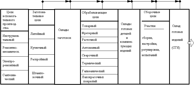 Если в пределах цеха или участка осуществляется законченный цикл изготовления детали или изделия, это подразделение называется предметно-замкнутым. На таком участке используется разнотипное оборудование, которое располагается по ходу технологического процесса. Рабочие места специализируются на изготовлении определенного вида продукции (деталей). На участке заняты рабочие разных специальностей. Разновидностью такого типа цехов (участков) являются поточные линии. Этот тип специализации характерен для крупносерийного и массового производств, обладает значительными экономическими преимуществами, так как позволяет сократить длительность производственного цикла в результате полного или частичного устранения встречных или возвратных перемещений, снижаются потери времени на переналадку оборудования, упрощается система планирования и оперативного управления ходом производства. Предметно-технологическая или смешанная специализация является наиболее распространенной. В основу создания цехов положен принцип, когда технологически специализированные цехи в тоже время имеют ограниченную номенклатуру предметного порядка (с учетом габаритов оборудования или продукции, используемого сырья и т.п.). При данной производственной структуре заготовительные цехи имеют технологическую структуру, обрабатывающие — подетально-узловую, а сборочные — предметную.
