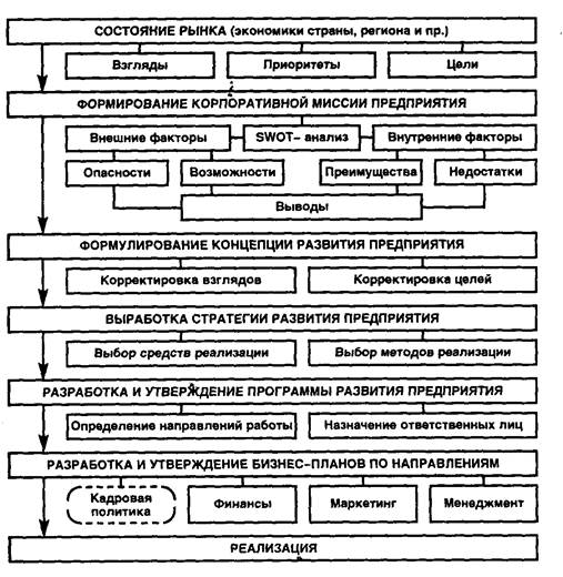 Как следует из представленной схемы, разработке кадровой политики предприятия предшествует значительная аналитическая работа. Она начинается с предварительной Оценки состояния рынка, на который намеревается выйти то или иное предприятие. Безусловно, эта оценка будет в известной степени субъективной поскольку она будет формироваться исходя из приоритетов руководства предприятия и не без учета взглядов и целей последнего, На основе полученной оценки состояния рынка формируется корпоративная миссия предприятия (от лат. тssiо — поручение), отражающая предназначение и наиболее общие цели последнего. Дальнейшее продвижение по пути разработки кадровой политики предприятия лишь на основе корпоративной Миссии будет весьма затруднительным Ускорить эту работу позволит глубокий комплексный анализ положения дел на предприятии — так называемый SWОТ- анализ. Исходя из всесторонней оценки как внешнего окружения. так и внутреннего состояния предприятия и сделанных на этой основе выводов становится возможным формулирование концепции развития предприятия (от лат. сопcереtiо — понимание, система). Концепция — это систематизированное понимание. если угодно, замысел развития предприятия. Концепция основывается на положению корпоративной миссии (но не повторяет их!) и одновременно отражает в своем содержании важнейшие выводы, полученные по итогам SWОТ -анализа. На основе концепции осуществляется корректировка (в ряде Случаев — пересмотр) взглядов и целей руководства относительно генерального курса развития предприятия. Уточнение взглядов. предприятия. Именно поэтому краткосрочные планы работы и целей, в свою очередь. позволяет выработать стратегию развития предприятия.. Отличие стратегии от концепции состоит в том, что наряду с теорией развития в ней отражаются также основные средства и методы достижения целей развития предприятия на предстоящие 10—15, а иногда и более лет. Окончательный выбор средств и методов достижения целей предприятия открывает дорогу к разработке и утверждению программы развития предприятия, как правило. рассчитанной на срок от 4 до 7 лет. На основе программы осуществляется «нарезка» основных направлений работы, а также назначение должностных лиц, ответственных за планирование и реализацию работы на «своем» направлении (в том числе и кадровом). Содержание работы по каждому направлению (кадровая работа, маркетинг, финансы и т. д.) регламентируется бизнес-планом. Бизнес-план — это документ среднесрочного планирования по одному из ключевых направлений деятельности предприятия. На основе бизнес -плана осуществляется краткосрочное (годовое. квартальное и месячное) планирование по тому или иному направлению деятельности предприятия. В свою очередь, краткосрочное планирование кадровой работы является отправной точкой этапа реализации кадровой политики предприятия. Именно поэтому краткосрочные планы работы называют также планами реализации. Основные этапы разработки кадровой политики предприятия отражены в таблице.