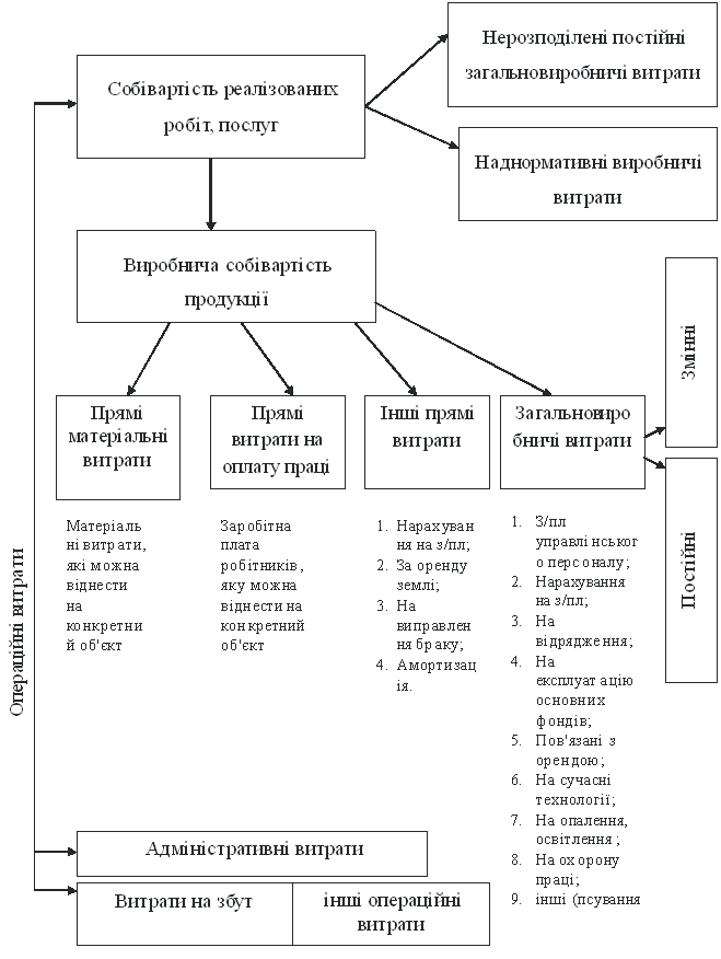 Цехова собівартість — це витрати конкретного цеху на виробництво продукції. Виробнича собівартість показує всі витрати підприємства на виробництво продукції. Цехові витрати в більшості галузей промисловості включаються в собівартість окремих видів продукції через розподіл їх пропорційно сумі заробітної плати робітників. Наприклад, сума цехових витрат за місяць становила 78 тис. грн., а основна заробітна плата робітників – 100 тис. грн. Це означає, що в собівартість окремих видів продукції цехові витрати будуть включені в розмірі 78% від суми основної заробітної плати виробничих робітників, нарахованої за окремими видами продукції. Суть інших видів собівартості продукції випливає вже із самої їх назви Стосовно об'єкта витрати від операційної діяльності можна розділити в такий спосіб: див. схему представлену на рис. 5.1. До інших операційних витрат належать: – витрати на дослідження й розробки; – собівартість реалізованих виробничих запасів; – сума безнадійної дебіторської заборгованості; – втрати від знецінювання запасів; – нестачі й втрати від псування цінностей; – штрафи, пені, неустойки; – витрати на утримання об'єктів соціально-культурного призначення. Витрати від операційної діяльності можливо також групувати по економічних елементах: – матеріальні витрати; – витрати на оплату праці; – відрахування на соціальні заходи; – амортизація; – інші операційні витрати.