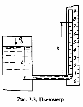 Простейшие приборы для измерения давления — пьезометры представляют собой стеклянные трубки диаметром не менее 0,5 см. Подсоединение пьезометра к сосуду, в котором измеряется давление, показано на рис. 3.3. Верхний конец пьезометра сообщается с атмосферой. За счет разности давлений в сосуде и атмосферного жидкость поднимается в трубке на пьезометрическую высоту h р. Избыточное давление в сосуде