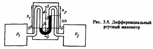 Ртутные манометры применяют для измерения давлений в диапазоне 0,3...0,4 МПа. Для измерения разности давлений, например, в двух сосудах (рис. 3.5) используют дифференциальные манометры. Когда давление в сосудах одинаковое (р1 = р2), ртуть в обеих частях среднего колена манометра находится на одном уровне. При р 1 > р 2 ртуть займет положение, соответствующее условиям равновесия.