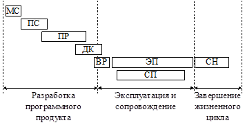 Стадия разработки ПП включает следующие частично перекрывающиеся этапы. МС – маркетинг рынка ПО и формирование требований к ПП предназначены для изучения требований к создаваемому ПП, включающие следующие действия: - изучение сегмента рынка ПО, где предполагается использование разрабатываемого ПП, и анализ аналогичных ПП; определение состава и назначения функций обработки данных ПП; - установление требований пользователя к способу взаимодействия с ПП (система меню, использование манипулятора «мышь», типы подсказок, виды экранных документов и т. п.); - определение аппаратных и программных средств, необходимых для эксплуатации ПП. ПС – проектирование структуры ПП связано с разработкой структуры ПП, структуры информационной базы задачи, выбором методов и средств создания программ – технологии программирования. ПР – программирование и тестирование программ являются технической реализацией проектных решений и выполняются с помощью выбранного инструментария разработчика, включающего языки и системы программирования. Разработка отдельных модулей ПП ведется параллельно для сокращения продолжительности этого этапа. Тестирование является важным этапом разработки ПП и часто требует не меньше времени, чем программирование. Программа проверяется на устойчивость работы в случае неверных входных данных, ошибочных действиях пользователя и сбое аппаратного обеспечения. Тестирование разбивается на два этапа. Альфа-тестирование осуществляется в месте его разработки, и его результатом является стабильно работающая программа. Бета-тестирование производится у заказчика ПП для проверки его функциональности и выявления оставшихся ошибок. Тестирование продолжается и на этапе эксплуатации. ДК – документирование ПП заключается в разработке необходимых сведений по установке и обеспечению надежной работы ПП, поддержке пользователей при выполнении функций обработки системой помощи и подсказок, определении порядка взаимодействия ПП с другими программами. Стадия эксплуатации и сопровождения включает следующие этапы. ВР – выпуск ПП на рынок ПО сопровождается различными приемами маркетинга: рекламой, увеличением числа каналов реализации, скидками, службой поддержки и др. ПП может быть выпущен на рынок как коммерческое, условно-бесплатное (shareware) или бесплатное (freeware) ПО. Для получения копии коммерческого пользователь должен предварительно его оплатить. Условно-бесплатное ПО является ознакомительным. Пользователь может попробовать данный ПП в течение определенного периода. По истечению этого периода пользователь должен купить ПО или отказаться от его использования. Бесплатное ПО не имеет ограничений на использование. ЭП – эксплуатация ПП идет параллельно с этапом сопровождения. При этом эксплуатация может начинаться раньше и заканчиваться позже сопровождения. СП – сопровождение ПП заключается в поддержке работоспособности ПП, переход на его новые версии, усовершенствование, исправление обнаруженных ошибок и т. п. Стадия завершения жизненного цикла состоит из одного этапа. СН – снятие ПП с продажи и отказ от сопровождения происходит, как правило, по следующим причинам: - появлением новых технологий и устройств; - плохих отзывах пользователей; - смене политики разработчика этого ПП. Длительность жизненного цикла дл