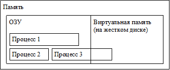 После запуска процесса ему выделяется адресное пространство. В памяти могут располагаться несколько процессов, причем один процесс не имеет доступ к адресному пространству другого процесса. Если объема ОЗУ не хватает для выполнения всех процессов, то выделяется виртуальная память на жестком диске, где хранится часть данных процесса. Жесткий диск, на котором располагается виртуальная память, гораздо медленнее, чем ОЗУ, поэтому в виртуальной памяти хранятся процессы, остановленные в данный момент или с самым низким приоритетом.