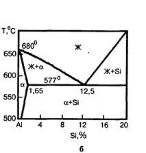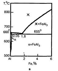 Рис. 9.1. Діаграми стану систем: а - алюміній-залізо; б - алюміній-кремній