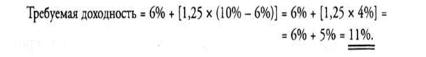 Следует отметить, что требуемая доходность для данной ценной бумаги растет с увеличением ее фактора "бета" *. Применение модели может быть проиллюстрировано следующим примером. Предположим, ценная бумага с фактором "бета" 1,25 рассматривается в тот момент, когда ставка безрисковых активов составляет 6%, а рыночная доходность — 10%. Подставляя эти данные в уравнение САРМ, получаем: