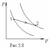 1. Энтропия — функция состояния. Если процесс проводят вдоль адиабаты, то энтропия системы не меняется. Значит адиабаты — это одновременно и изоэнтропы. Каждой более “высоко” расположенной адиабате (изоэнтропе) отвечает большее значение энтропии. В этом легко убедиться, проведя изотермический процесс между точками 1 и 2, лежащими на разных адиабатах (рис.5.8). В этом процессе Т = const, поэтому образом, зная, как выглядит система адиабат, можно легко ответить на вопрос о приращении энтропии при проведении любого процесса между интересующими нас равновесными состояниями 1 и 2.