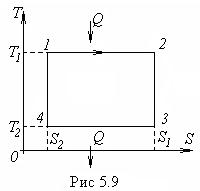 Доказано, что КПД всех обратимых машин, работающих при одних и тех же температурах нагревателя и холодильника, одинаков и определяется только температурами нагревателя и холодильника. Это теорема Карно. Машина Карно (двигатель Карно) - самая эффективная из всех возможных типов тепловых машин. В машине Карно используется цилиндр с поршнем, она не имеет каналов, так что во всех циклах многократно используется одно и тоже рабочее вещество. Источник энергии (бензин, мазут и др.) используется для поддержания постоянной температуры Т 1 теплового резервуара. Для работы машины необходим еще один резервуар с температурой Т 2 (холодильник, например, озеро или река с водой). Рассмотрим необратимый цикл. Пусть машина работает с тем же нагревателем и холодильником, что и при обратимом цикле. После цикла машина возвращается в исходное состояние, поэтому приращение энтропии за цикл