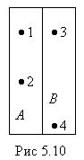 Состояние термодинамической системы может быть задано значением ее параметров – температуры, давления, объёма, внутренней энергии и т.п., характеризующих систему как целое. Это макросостояние системы. Если состояние макроскопического тела задано столь подробно, что известны состояния всех образующих тело молекул, то такое состояние называется микросостоянием. Любое макросостояние может быть задано разными способами, каждому из которых соответствует некоторое микросостояние. Число различных микросостояний, соответствующих данному макросостоянию, называется термодинамической вероятностью или статистическим весом макросостояния. Таким образом, термодинамическая вероятность – это число способов, которыми может быть осуществлено данное макросостояние. Некоторое представление о статистическом весе можно получить, рассмотрев способы, которыми молекулы могут быть распределены между двумя половинками сосуда с газом. Возьмем случай, когда в сосуде, разделенном на две одинаковые половины А и В (рис.5.10), находится число молекул N= 4. Перенумеруем их: 1,2,3.4. Каждая молекула с равной вероятностью может находиться как в половине А, так и в половине В. Значит, вероятность того, что любая молекула окажется в половине А, равна Подобные рассуждения приводят к выводу, что вероятность любого размещения четырех молекул равна