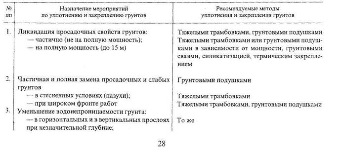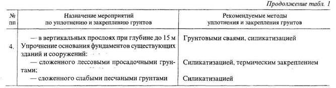 Лекция 4. УСТРОЙСТВО ОСНОВАНИЙ ПОД ФУНДАМЕНТЫ И ЗАКРЕПЛЕНИЕ ГРУНТОВ Контроль качества работ по устройству оснований под фундаменты и сооружения и закреплению грунтов постоянно ведется наблюдением за их исполнением в соответствии с проектной документацией и требованиями СНиП 3.02.01.-87 «Основания и фундаменты»; СНиП Ш-4-80**, Глава 4. «Техника безопасности в строительстве»; ДБН А. 3.1-5-96 «Организация строительного производства». В строительстве часто приходится возводить сооружения на сильносжимаемых и малопрочных грунтах. Новые типы конструкций зданий (крупноблочные и крупнопанельные), весьма чувствительны к неравномерным осадкам основания. Это приводит к росту той части осадок, которая происходит после окончания строительства в период эксплуатации, и увеличению неравномерности осадок фундаментов. Устройство оснований для слоя маловлажного грунта, взрыхленного в процессе производства земляных работ, осуществляется методом уплотнения грунта катками, вибротрамбовками и др. Подготовка контактного слоя для сборных железобетонных и бетонных фундаментов производится путем укладки слоя песка толщиной 10 см (независимо от вила грунтовых условий). Другим методом является подготовка основания укладкой слоя цементного или известкового на поверхности дна котлована непосредственно перед устройством фундаментов, толщиной слоя не менее 5 см. В водонасыщенных грунтах подготовка контактного слоя должна заключаться в укладке и уплотнении слоя песка или щебня толщиной 10—15 см. Для повышения прочности и устойчивости грунтов или придания им свойств водонепроницаемости производится закрепление грунтов способами цементации, глинизации, битумизации, силикатизации, смолизации и термического закрепления, а также уплотнения грунта. Таблица 1 Методы уплотнения и закрепления грунтов