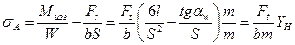 s A = s изг А - s сжатия А. Напряжения сжатия вычитаются из напряжений изгиба. Учитывая, что напряжения изгиба в консольной балке равны частному от деления изгибающего момента Mизг на момент сопротивления корневого сечения зуба W, а напряжения сжатия это сила Fr, делённая на площадь корневого сечения зуба, получаем: