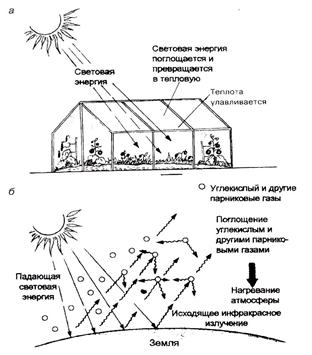 Климат Земли, который зависит главным образом от состояния ее атмосферы, на протяжении геологической истории периодически изменялся: чередовались эпохи значительного похолодания, когда большие территории покрывались ледниками, и эпохи потепления. Но в последнее время ученые метеорологи бьют тревогу: похоже на то, что атмосфера Земли разогревается значительно быстрее, чем когда-нибудь в прошлом. Это обусловлено деятельностью человека, которая, во-первых, разогревает атмосферу путем сжигания большого количества угля, нефти, газа, а также работы атомных электростанций. Во - вторых, и это главное, сжигание органического топлива, а также уничтожение лесов приводит к накоплению в атмосфере большого количества углекислого газа. За последние 120 лет содержание этого газа в воздухе увеличилось на 17% В земной атмосфере углекислый газ действует как стекло в теплице или парнике: он свободно пропускает к поверхности Земли солнечные лучи, но удерживает тепло нагретой Солнцем поверхности Земли. Это вызывает разогревание атмосферы, известное как парниковый эффект. По подсчетам ученых, в ближайшие десятилетия среднегодовая температура на Земле за счет парникового эффекта может увеличиться на 1,5 – 2 С.