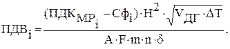 где ПДКМРi – максимальная разовая предельно допустимая концентрация i-того вещества в приземном слое атмосферы, мг/мі; Сфi – фоновая концентрация вредного вещества в приземном слое атмосферы, мг/мі; А – коэффициент атмосферной температурной стратификации, определяющий условия вертикального перемещения слоев (240 – для Юж. Украины, 200 – для Зап. и Вост. Украины, 160 – для Сев. Украины, 120 – для Центр. Украины); F – коэффициент, учитывающий скорость оседания частиц (для газов – 1, для пыли при разных степенях очистки – 2…3); m, n – коэффициенты, учитывающие условия выбросов (при оценочных расчетах их произведение может быть принято равным 1); δ – коэффициент, характеризующий местность (для равнины – 1, для пересеченной – 2); Н – высота трубы, м; VДГ – объемный расход дымовых газов, мі/с; ΔТ – разность температур уходящих газов и наружного воздуха, °С.