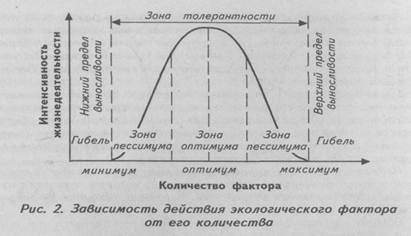 Экологические факторы – это определенные условия и элементы среды, которые оказывают специфическое воздействие на организм. Они подразделяются на абиотические, биотические и антропогенные. Факторы среды имеют количественное выражение (рис. 2). По отношению к каждому фактору можно выделить зону оптимума (зону нормальной жизнедеятельности), зону пессимума (зону угнетения) и пределы выносливости организма. Оптимум — такое количество