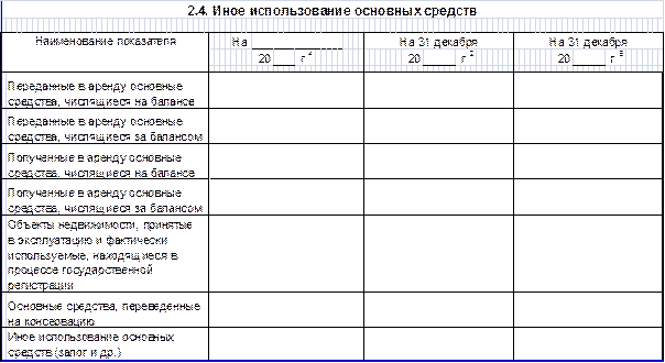 8. Порядок формирования Пояснений на основании забалансовых счетов Данные об остатках на забалансовых счетах с 2011 года отражаются в Пояснениях. Примерная форма Пояснений в виде таблицы приведена в Приложении № 3 к приказу Минфина РФ 66 н. При этом организация может выбрать рекомендованный вариант формы или разработать свою форму, но с обязательным условием, чтобы в Пояснениях была раскрыта вся существенная информация для заинтересованных пользователей. В пояснениях 2.4 «Иное использование основных средств» отражаются на отчетную дату, на 31 декабря предыдущего года и на 31 декабря года, предшествующего предыдущему: - переданные в аренду основные средства, числящиеся за балансом; - полученные в аренду основные средства, числящиеся за балансом. Показатели формируются на основании остатков по забалансовым счетам 011 «Основные средства, сданные в аренду», 001 «Арендованные основные средства». Отражается стоимость основных средств, полученных от других предприятий или физических лиц по договорам аренды или безвозмездного пользования. Это имущество учитывается в оценке, указанной в договорах.