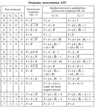 Арифметико-логическое устройство является основой не только микропроцессора (МП), но и любого другого устройства с программируемой логикой, которое предназначено для обработки информации. Современные ЭВМ используют МП (и соответственно АЛУ) с очень большими значениями разрядности, быстродействия, числа регистров и т.п. Рассмотреть работу АЛУ легче при более простых схемах. При анализе архитектуры МП будем считать, что его АЛУ по своим функциональным возможностям, разрядности и набору входов и выходов соответствует стандартному 4-разрядному АЛУ, условное обозначение которого приведено на рис. 9.7. Это АЛУ содержит две входные (A и В) и одну выходную (F) 4-разрядные шины. Информация, поступающая по входным шинам, обрабатывается в соответствии с набором управляющих сигналов, подаваемых на управляющие входы АЛУ М, S1, S2, S3,S0). Результат обработки появляется на выходной шине. Вход С служит для приема сигнала переноса, а на выходе переноса С 4 образуется сигнал старшего разряда при выполнении арифметических действий, с выхода А = В подается сигнал о равенстве входных двоичных слов А и В при поразрядном сравнении. Этот выход позволяет использовать данную микросхему АЛУ в качестве компаратора. Дополнительные выходы G (образования ускоренного переноса) и Р (распространения ускорения ускоренного переноса) используются при организации многоразрядных АЛУ. Реализуемые в АЛУ операции представлены в табл. Другим важным узлом МП является набор регистров общего назначения (РОН), часто называемый сверхоперативным запоминающим устройством (СОЗУ). В РОН хранятся информационные слова, подлежащие обработке в АЛУ, результаты обработки информации в АЛУ и управляющие слова. Обращение к РОН — адресное. Эти регистры допускают считывание и запись информации, поэтому содержат входную и выходную шины, адресную шину и управляющий вход, информация на котором задает режим работы (запись, хранение или чтение информации).