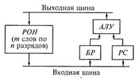 Рис. 9.8. Упрощенная структурная схема обрабатывающей части микропроцессора Очевидно, что для выполнения этих и других операций в АЛУ, РОН и вспомогательные регистры БР и PC должны подаваться определенные управляющие сигналы, причем важное значение имеет распределение этих сигналов во времени. Например, для передачи данных из одного РОН в другой требуются два такта: такт 1 — адресация РОН, выборка содержимого РОН, прием выбранного слова в БР; такт 2 — адресация РОН, запись в РОН информации, переданной на вход РОН через АЛУ. Тактовые сигналы могут поступать от тактового генератора. Максимально возможная частота, а значит, и время выполнения операций, будут определяться задержкой сигналов на различных компонентах схемы. В современных микропроцессорах АЛУ является только частью микросхемы сверхбольшой интеграции. Но среди микросхем просто большой интеграции имеются специальные микросхемы специализированного назначения, которые так и называются — арифметико-логические устройства. Примерами таких микросхем являются К155ИПЗ и 564ИПЗ.
