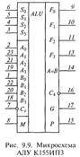Микросхема К155ИПЗ (рис. 9.9) предназначена для действий с двумя 4-разрядными двоичными словами: На выходах F3, F2, F1 F0 формируются результаты логических преобразований и арифметических действий. На выходе переноса С 4 образуется сигнал старшего (пятого) разряда при выполнении арифметических операций. Дополнительные выходы Р и G используются только при организации многоразрядных АЛУ в случае их сочетания с блоком ускоренного переноса. Слова А и В, подлежащие обработке, могут быть представлены в положительной или отрицательной логике, но таблицы истинности для каждого варианта логики отличаются друг от друга. Старший разряд кода выбора операции (вход М) определяет характер действий, выполняемых АЛУ. При М= 1 АЛУ производит логические операции поразрядно над каждой парой бит слои А и В.