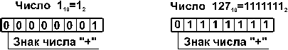 Рассмотрим особенности записи целых чисел со знаком на примере однобайтового формата, при котором для знака отводится один разряд, а для цифр абсолютной величины – семь разрядов.