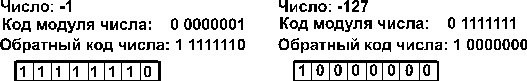 2. Обратный код. Получается инвертированием всех цифр двоичного кода абсолютной величины числа, включая разряд знака: нули заменяются единицами, а единицы — нулями. Например: