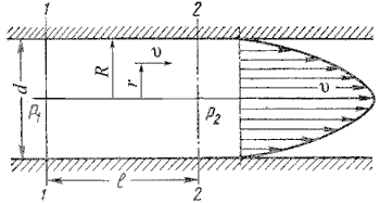 где P1 и P2 - давления соответственно в сечениях 1 и 2. У стенок трубы величина r = R,, значит скорость υ = 0, а при r = 0 (на оси потока) скорость будет максимальной