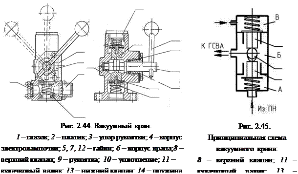 Для подачи воды центробежными насосами их рабочие полости и всасывающие рукава необходимо заполнить водой. Это осуществляется вакуумными системами. Их основу составляют вакуумные насосы и краны, трубопроводы и приводы управления. На АЦ, АНР и мотопомпах в качестве вакуумных насосов применяют газоструйные, шиберные, поршневые и иногда водокольцевые насосы. Приводы к ним могут быть ручными или комбинированными: ручными и автоматическими. Последние обеспечивают автоматический забор воды при пуске насоса и восстановление обрыва водяного столба. Газоструйные вакуумные системы. Эти системы применяются на АЦ и АНР с насосами ПН-40, ПН-60 и ПН-110. В их систему входят вакуумные краны, газоструйные вакуумные аппараты (ГСВА), трубопроводы. Вакуумный кран предназначен для соединения внутренней полости насоса с газоструйным вакуумным аппаратом. Он устанавливается на коллекторе насоса. Его устройство показано на рис. 2.44, а принципиальная схема – на рис. 2.45. На этом рисунке показано положение, когда кулачковый валик 11 отжал нижний клапан 13. В этом положении пружина верхнего клапана 8 прижмет его к седлу и разобщит полости Б и В. При таком положении клапанов 8 и 11 отсасываемый из насоса ГСВА воздух пройдет в полость А и Б и по трубке б к струйному насосу. Это показано сплошными стрелками. По заполнении насоса водой кулачковый валик поворачивают так, чтобы нижний клапан 13 разобщил полости А и Б, а верхний клапан 8 соединил полость Б и В. В этом положении струйный насос отсосет из полости Б и трубки, соединяющей вакуумный клапан с ГСВА, попавшую туда воду. Воздух по отверстию а поступит в полость В и Б и в трубку б.